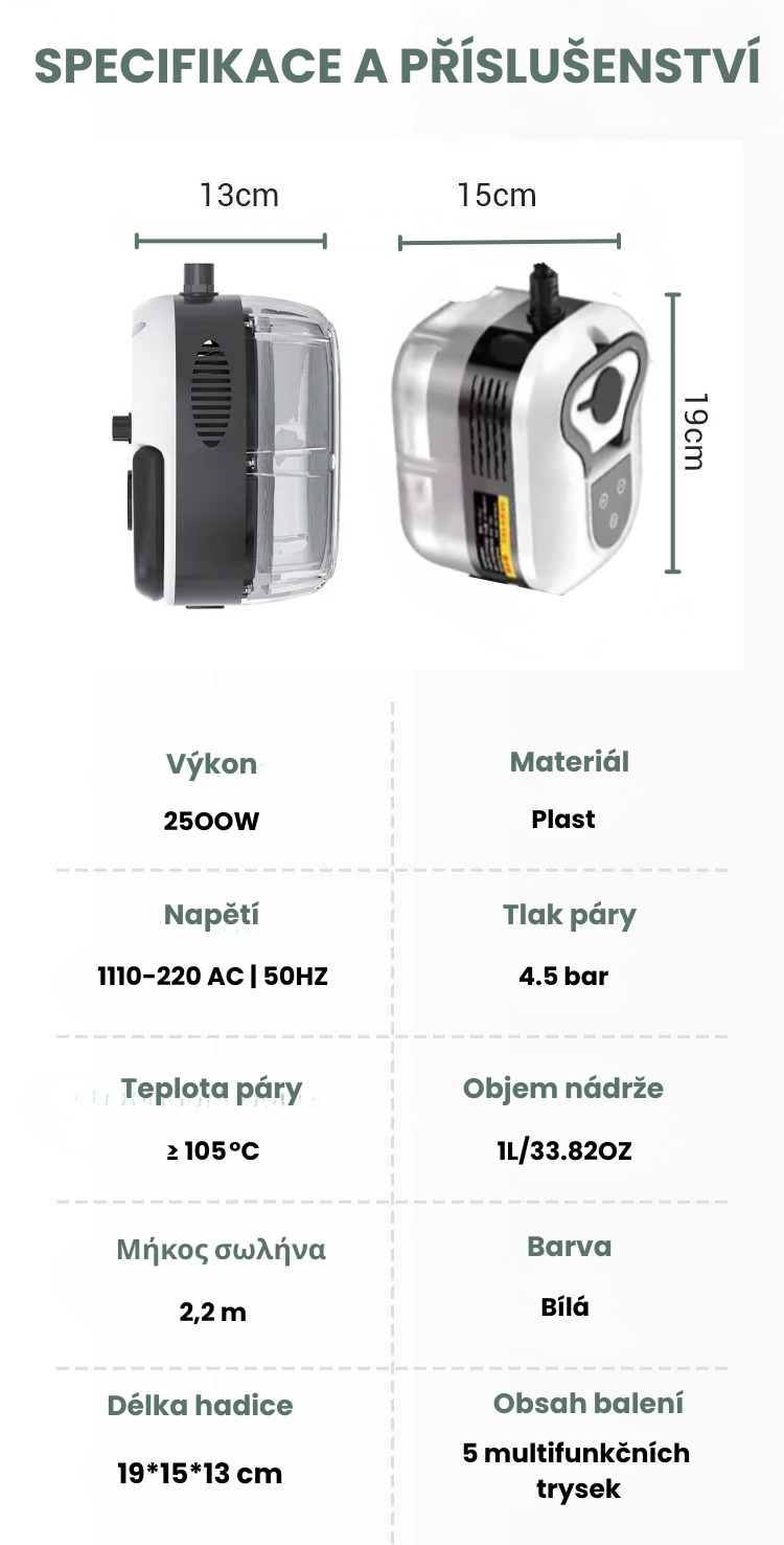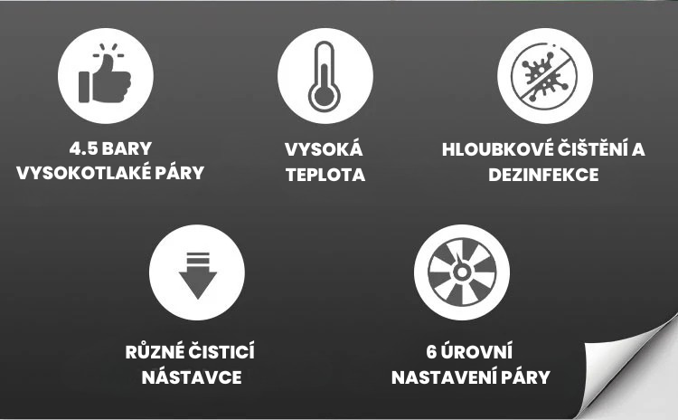 Pára se uvolňuje podle potřeby a čistí, dezinfikuje, odmašťuje a odstraňuje zápach z téměř všech povrchů, aniž by bylo potřeba používat chemické čisticí prostředky.